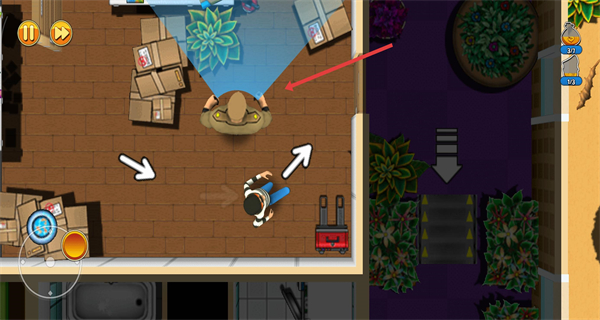 3、繼續(xù)跟隨箭頭指引,注意躲避看守視線,繞過看守繼續(xù)前進。