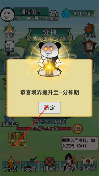 4、頁面顯示恭喜境界提升至分神期,點擊確定后即完成渡劫。