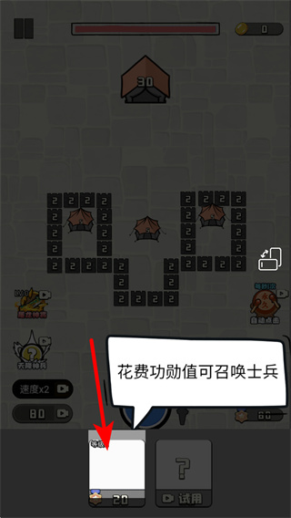 1、在游戲界面,消耗對應(yīng)的功勛值召喚士兵,借助士兵的戰(zhàn)力參與戰(zhàn)斗,推進關(guān)卡中對敵方單位的清理進度。