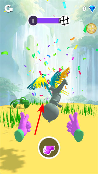 2、觸發(fā)道具后,角色會被彈射至場景中的目標如鸚鵡,完成互動后積累進度界面上方的進度條,同時獲取鉆石等獎勵。