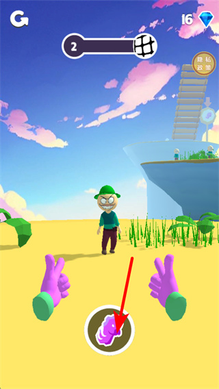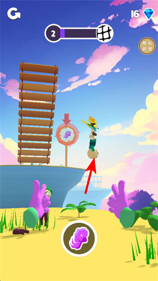 1、在游戲界面,點擊底部的紫色道具區(qū)域觸發(fā)互動,這是啟動角色彈射的核心操作,可通過該操作推進關卡中的挑戰(zhàn)。