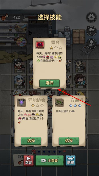 4、解鎖技能選擇界面,挑選舞臺、異能協(xié)會等技能,提升基地生存效率。