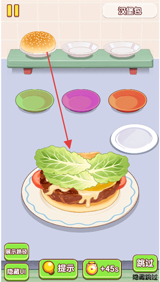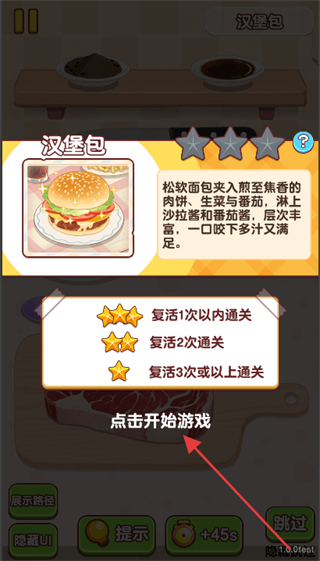 1、當前關(guān)卡是漢堡包,了解通關(guān)星級規(guī)則,點擊點擊開始游戲按鈕進入游戲。