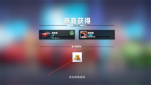 4、在比賽結(jié)算獎(jiǎng)勵(lì)界面顯示恭喜獲得的道具,按提示點(diǎn)擊屏幕繼續(xù)完成結(jié)算。