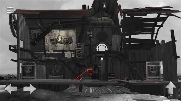 4、進(jìn)入建筑內(nèi)部場(chǎng)景后,操控角色在室內(nèi)區(qū)域移動(dòng),跳躍開(kāi)啟上方的紅色按鈕打開(kāi)木屋內(nèi)的燈光和大門,推進(jìn)游戲的后續(xù)內(nèi)容。