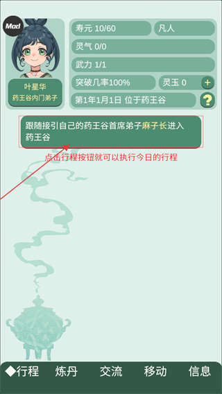 2、在藥王谷主界面,點擊行程區(qū)域?qū)?yīng)的行程按鈕,執(zhí)行跟隨麻子長進入藥王谷的當日行程操作。
