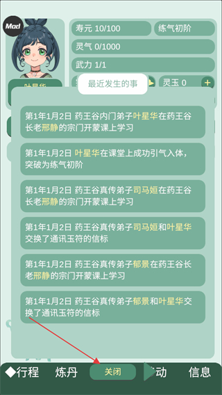 3、查看最近發(fā)生的事的劇情列表后,點擊底部的關(guān)閉按鈕,返回主界面繼續(xù)開展后續(xù)玩法。
