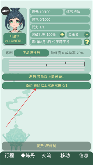 4、在煉丹界面選擇煉制下品辟谷丹,準備好君藥與臣藥等材料后,花費3天時間進行丹藥煉制操作。
