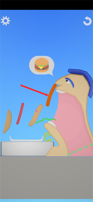 3、進(jìn)入新關(guān)卡后,觀察角色需求漢堡,拖動吸管連接食物與成人角色,這是滿足當(dāng)前需求的核心操作,開啟物品輸送流程。