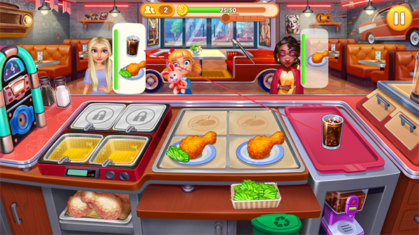 采用鮮明的美式卡通設計,色彩鮮艷明快,餐廳場景細節(jié)豐富,食物造型逼真且富有食欲,整體畫風精致靚麗,帶來愉悅的視覺體驗。