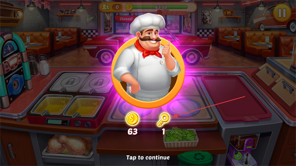 4、完成關卡后獲得金幣和鑰匙獎勵,點擊Taptocontinue繼續(xù)游戲。