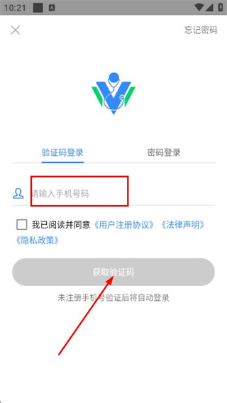 2、在手機(jī)驗(yàn)證登錄頁面填寫手機(jī)號,勾選協(xié)議后,點(diǎn)擊獲取驗(yàn)證碼。