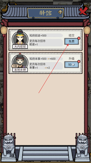 3、進入驛館界面后,點擊免費按鈕結交大內密探,能夠提升知府前途及吏員的招待屬性。