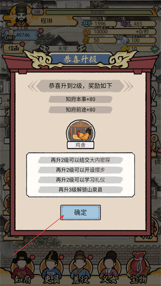 4、升級后彈出恭喜升級界面,可獲得知府本事+80等獎勵,點擊確定關閉界面,后續(xù)升級還有更多解鎖內容。