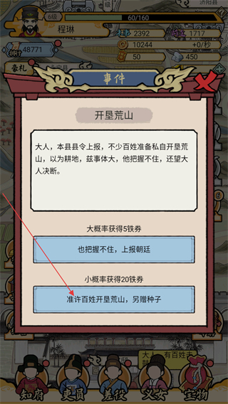 3. 在開墾荒山事件界面中,存在兩種決策選項(xiàng),選擇上報(bào)朝廷大概率獲得5鐵券,選擇準(zhǔn)許百姓開墾荒山,另贈(zèng)種子小概率獲得20鐵券,需點(diǎn)擊對(duì)應(yīng)按鈕完成決策。