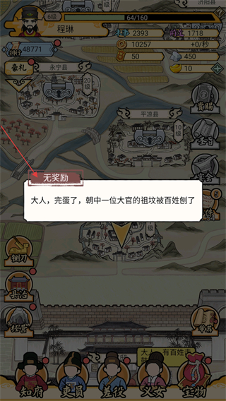 4. 完成事件選項(xiàng)的選擇后,會(huì)彈出對(duì)應(yīng)的結(jié)果提示如當(dāng)前提示朝中一位大官的祖墳被百姓刨了,該結(jié)果無(wú)獎(jiǎng)勵(lì),后續(xù)需繼續(xù)處理相關(guān)事務(wù)。