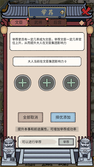 多維度養(yǎng)成玩法沒有固定的發(fā)展路線,可根據(jù)喜好選擇收養(yǎng)義女、專注政務(wù)等不同方向,無(wú)限金幣加持下,養(yǎng)成規(guī)劃的自由度大幅提升。