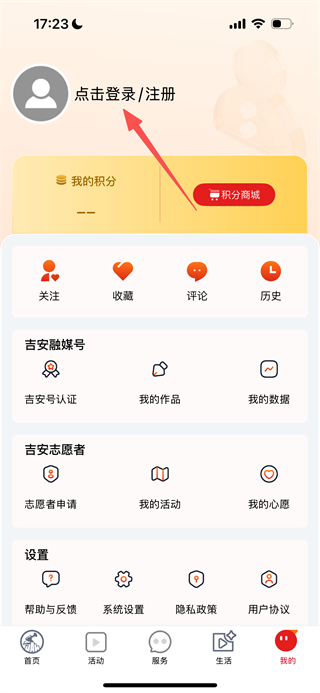2、在個(gè)人中心頁(yè)面,點(diǎn)擊點(diǎn)擊登錄注冊(cè)區(qū)域,進(jìn)入登錄頁(yè)面。