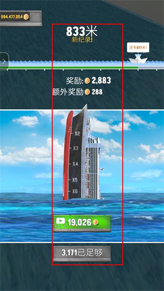 2、觀察界面顯示的跳躍速度數(shù)值,控制輪船在合適時機(jī)完成跳躍,同時留意跳躍距離的變化。