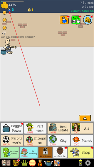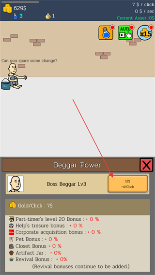 1、點(diǎn)擊BeggarPower按鈕,進(jìn)入乞丐能力界面,提升乞丐等級獲取更多收益。