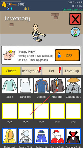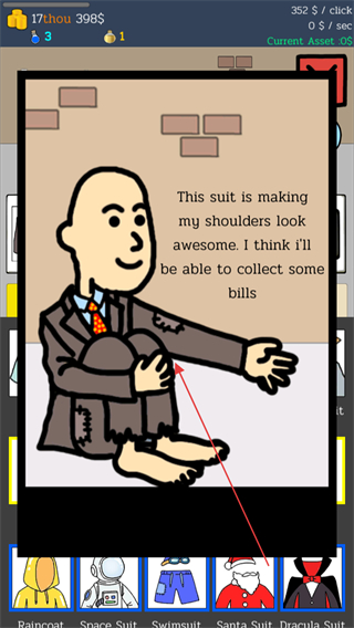 4、更換服裝后,乞丐外觀變化,同時(shí)提升收益效率,繼續(xù)積累金幣推進(jìn)游戲。