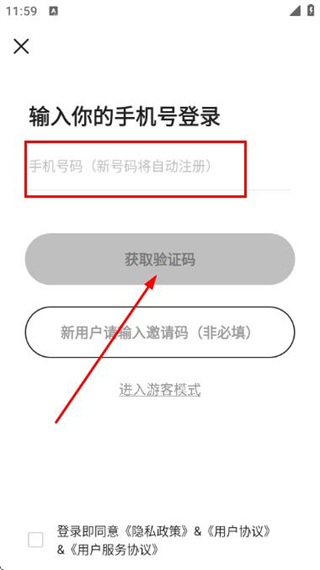 2、在手機登錄頁面填寫手機號,勾選協(xié)議后,點擊獲取驗證碼。