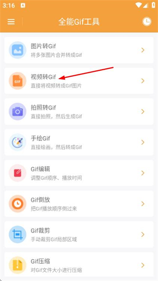 1、在全能Gif工具頁(yè)面點(diǎn)擊視頻轉(zhuǎn)Gif選項(xiàng),進(jìn)入視頻選擇頁(yè)面。