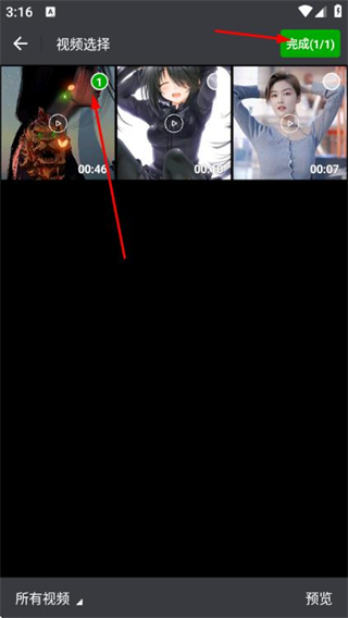 2、在視頻選擇頁(yè)面選中目標(biāo)視頻后,點(diǎn)擊右上角的完成按鈕,進(jìn)入視頻轉(zhuǎn)Gif頁(yè)面。