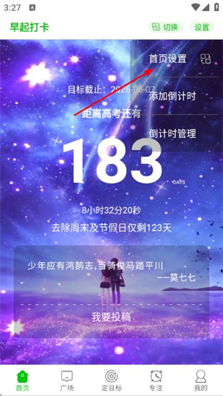 2、在設(shè)置選項(xiàng)菜單中點(diǎn)擊首頁設(shè)置,進(jìn)入倒計(jì)時設(shè)置頁面。