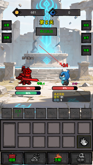 1、處于第2關(guān)戰(zhàn)斗界面,可點擊再次挑戰(zhàn)重玩本關(guān),關(guān)注怒氣值與敵方狀態(tài)推進戰(zhàn)斗。
