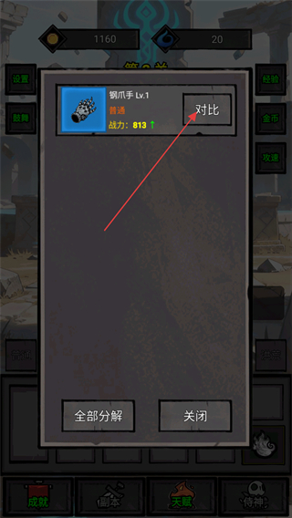 3、打開裝備界面查看鋼爪手Lv.1,點擊界面中的對比按鈕,可查看該裝備與當前裝備的屬性差異。