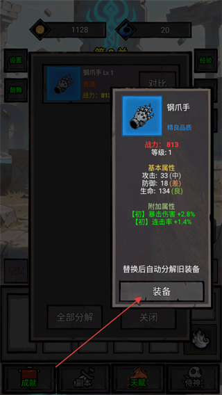 4、在鋼爪手裝備詳情界面,查看其基礎(chǔ)與附加屬性后,點擊裝備按鈕,即可穿戴該裝備提升自身戰(zhàn)力數(shù)值。