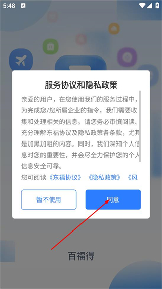 1、在服務(wù)協(xié)議和隱私政策彈窗中,點(diǎn)擊同意,進(jìn)入登錄頁(yè)面。