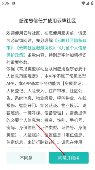 1、在云眸社區(qū)服務協(xié)議和隱私政策彈窗中,點擊同意,進入首頁。