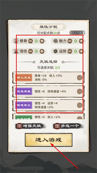 1、在屬性分配界面,分配屬性,同時(shí)選擇天賦,點(diǎn)擊進(jìn)入游戲開啟仙途。