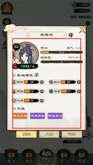 4、在彈出的屬性面板中,查看角色面板,確認(rèn)修為、基礎(chǔ)屬性與天賦效果。