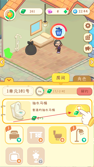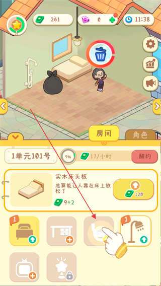 2、進(jìn)入房間裝修界面,選擇家具如實(shí)木床頭板、抽水馬桶,消耗綠色貨幣購買并布置到房間中,提升房間舒適度。