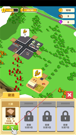3、選擇土路,消耗50金幣解鎖,該道路需玩家3級(jí)可使用,解鎖后可開(kāi)始鋪設(shè)。