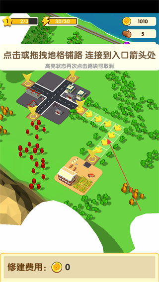 4、點(diǎn)擊或拖拽地格鋪筑路,連接到入口箭頭處,高亮狀態(tài)再次點(diǎn)擊道路可取消鋪設(shè)。
