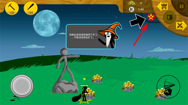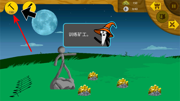 2、進(jìn)入游戲場(chǎng)景后,點(diǎn)擊礦工標(biāo)識(shí)可訓(xùn)練礦工單位,這些礦工是資源黃金的核心獲取來(lái)源,會(huì)自動(dòng)前往金礦采集資源,為后續(xù)招募士兵積累資金。