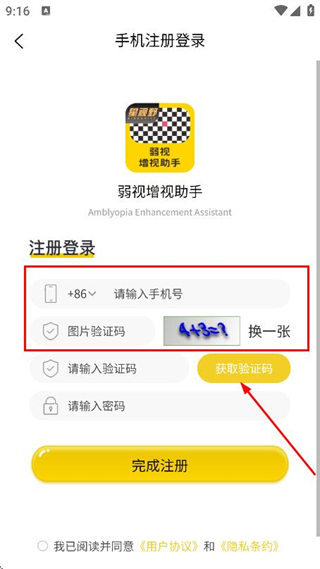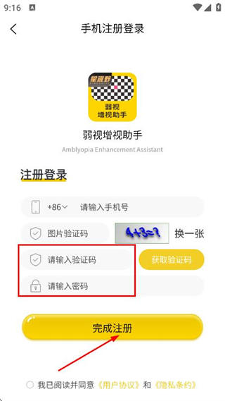 3、在注冊賬號頁面填寫驗證碼和密碼,勾選協(xié)議后點擊注冊完成賬號注冊操作。