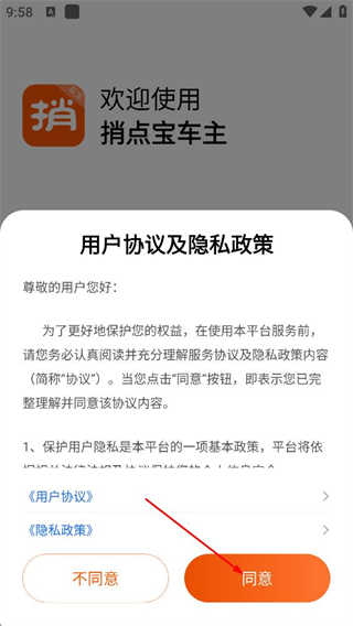 1、在捎點(diǎn)寶車主的用戶協(xié)議及隱私政策彈窗中,點(diǎn)擊同意,進(jìn)入頁面。