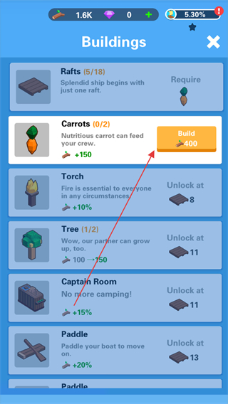 2、進(jìn)入Buildings界面,點(diǎn)擊Carrots對(duì)應(yīng)的Build,消耗400資源建造胡蘿卜設(shè)施。