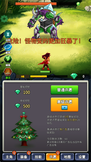 2、擊敗冰龍后點(diǎn)擊進(jìn)程碑,進(jìn)入新場景,繼續(xù)積累屬性點(diǎn)增強(qiáng)戰(zhàn)力。