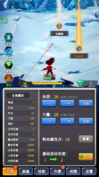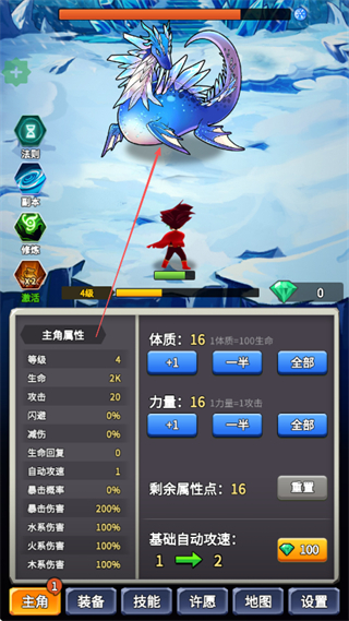 1、在戰(zhàn)斗界面給體質(zhì),力量加屬性點(diǎn),提升主角屬性,對(duì)戰(zhàn)冰龍推進(jìn)戰(zhàn)斗。