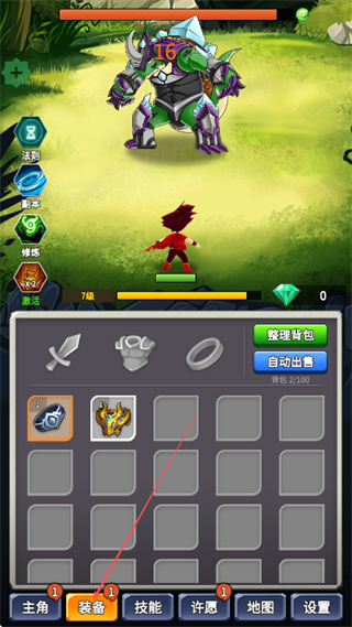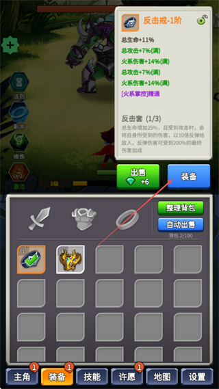 4、選擇反擊戒2階裝備,點(diǎn)擊裝備按鈕,提升主角的屬性與技能效果。