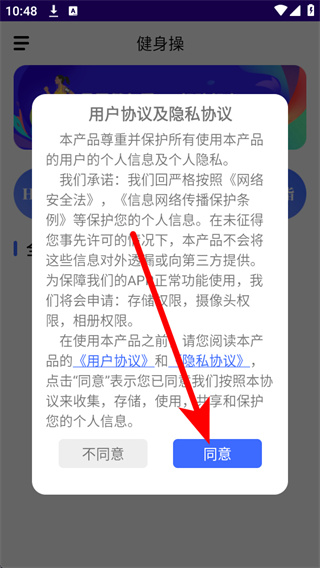 1、打開減肥操APP,在彈出的彈窗中點擊同意,進入應用主頁。