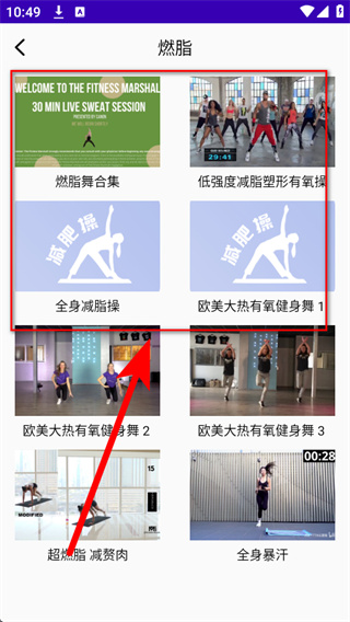 3、在分類列表中,選擇想要練習的健身操內(nèi)容,點擊進入該內(nèi)容的播放列表頁面。