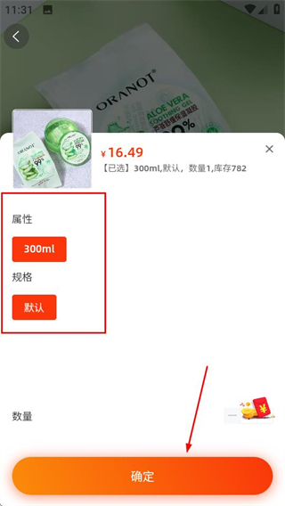 4、在規(guī)格選擇彈窗,確認(rèn)屬性和規(guī)格后點(diǎn)擊確定,進(jìn)入確認(rèn)訂單頁面。