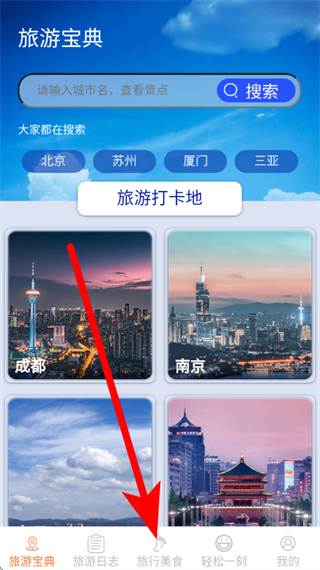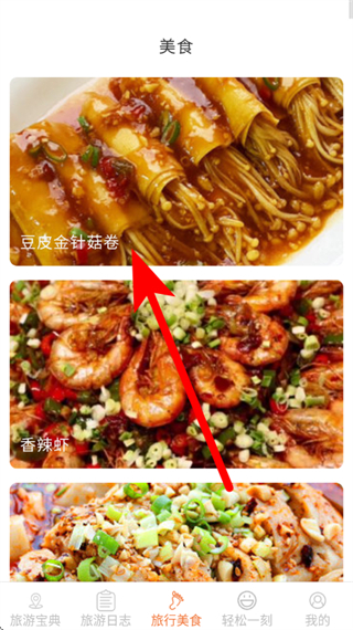 1、打開輕松趣旅行,點(diǎn)擊底部的旅行美食,進(jìn)入美食頁(yè)面。